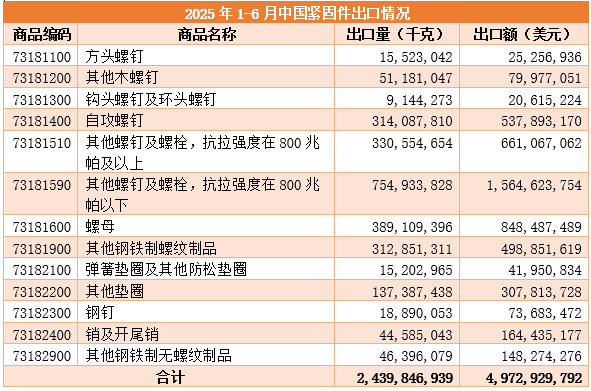 在出口方面,2025年1-6月中国钢铁制紧固件出口总量为2,439,846,939千克,与去年同期相比增长了14.1%;出口总金额为49.7亿美元,同比增长9.3%。这一增长态势表明中国紧固件在国际市场上的需求持续旺盛,产品竞争力不断提升。
