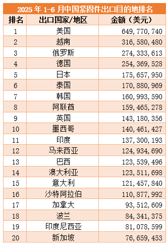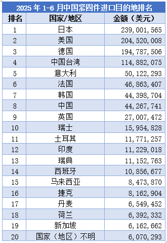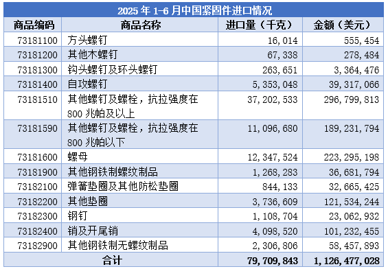 进口方面,2025年1-6月中国紧固件钢铁制进口总量为79,709,843千克,同比下降17.9%;进口总金额为11.3亿美元,同比下降8.3%。进口量和金额的双降,可能与国内紧固件企业技术提升、国产替代加速以及全球供应链调整等因素有关。